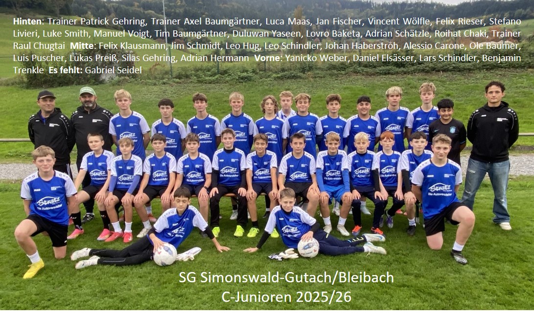 2025 C Jugend neuDank einer großzügigen Spende der Fa. Stratz KFZ Technik aus Glottertal, konnte unsere komplette C-Jugend, mit neuen Trainingsshirts ausgestattet werden. Vielleicht sind die Jungs deshalb hervorragend in die Saison gestartet: Die C1 gewann bisher beide Saisonspiele, bei der C2 gab es in 3 Spielen bisher auch nur eine Niederlage und 2 Siege.